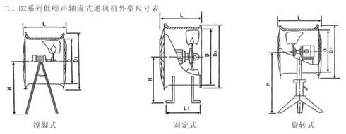 本系列風機有三種型式:DZ-Ⅰ型排風式(帶網罩、自垂百葉或彎頭),DZ-Ⅱ型管道式(電機內置或外置),電機外置管道式對電機有特殊要求場合,如廚房排油煙,工業排熱氣等地方使用,DZ-Ⅲ型崗位固定式。
